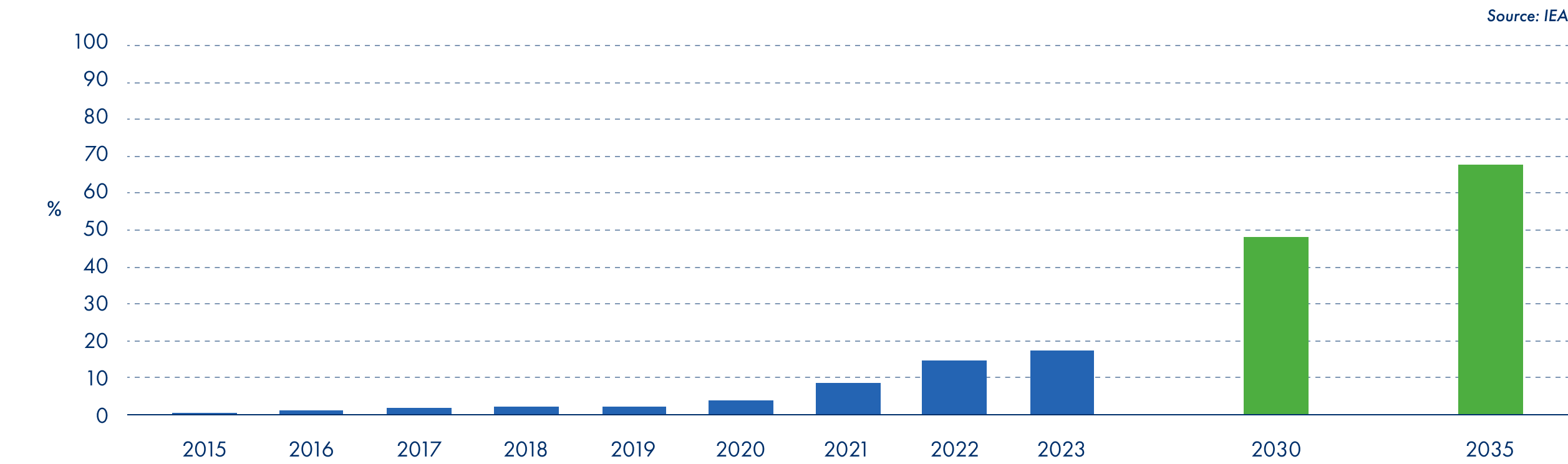 In a net zero scenario. where announced pledges are realised and governments meet their commitments on time, including longer-term targets, pledges in NDCs, and commitments to energy access, EVs can reach up to half of new vehicle sales by 2030 from current levels of 18% in 2023.
